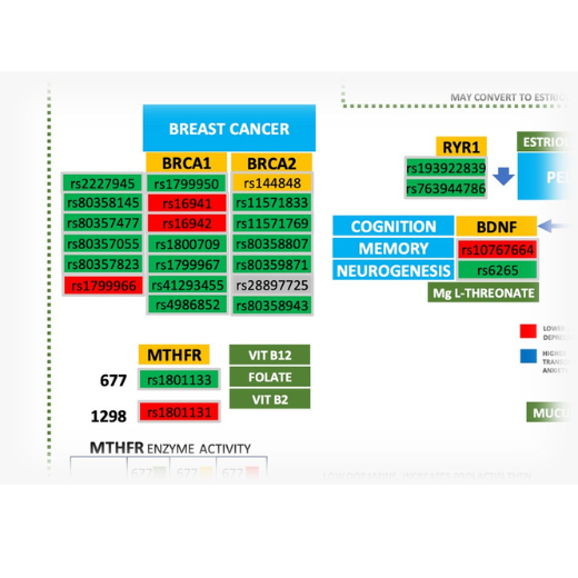 Provides a comprehensive, genetics-based approach to women’s health by analyzing key hormonal and metabolic markers. It helps understand how estrogen, progesterone, and testosterone levels fluctuate, impacting mood, metabolism, and bone health. Genetic insights are also used to assess the risk for osteoporosis and cardiovascular disease, enabling early preventive care. This pathway evaluates predispositions to depression, anxiety, and cognitive decline, offering guidance for emotional and mental well-being. Additionally, it helps determine the suitability of hormone replacement therapy (HRT) by identifying how your body metabolizes hormones.